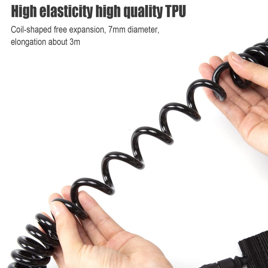 Surfboard & SUP coiled leash, 10 ft, 7mm TPU cord with neoprene cuff, strong, safe, durable, ideal for surfing, paddleboard, kayak